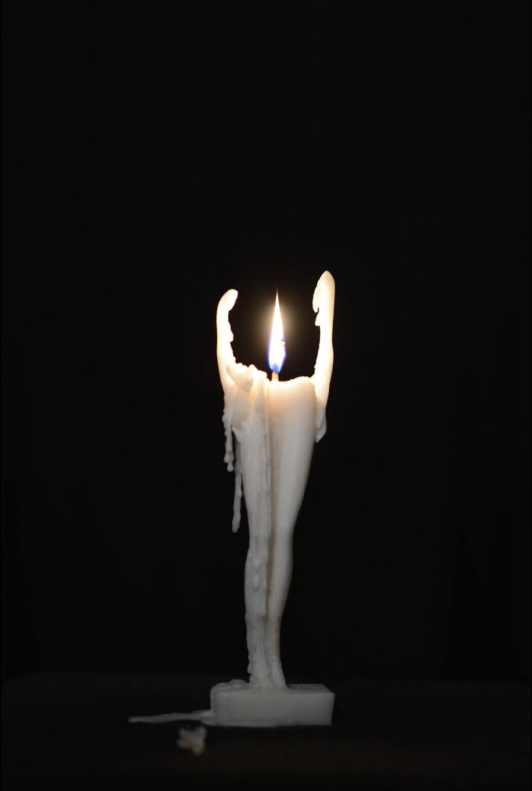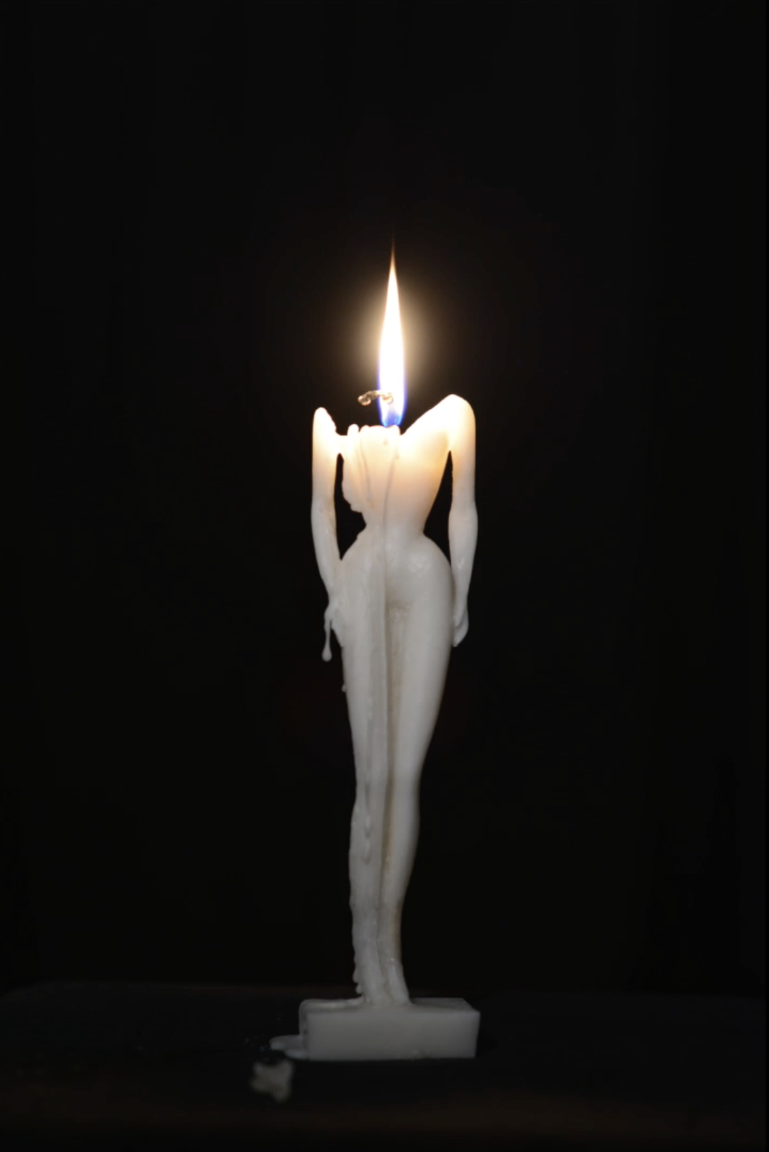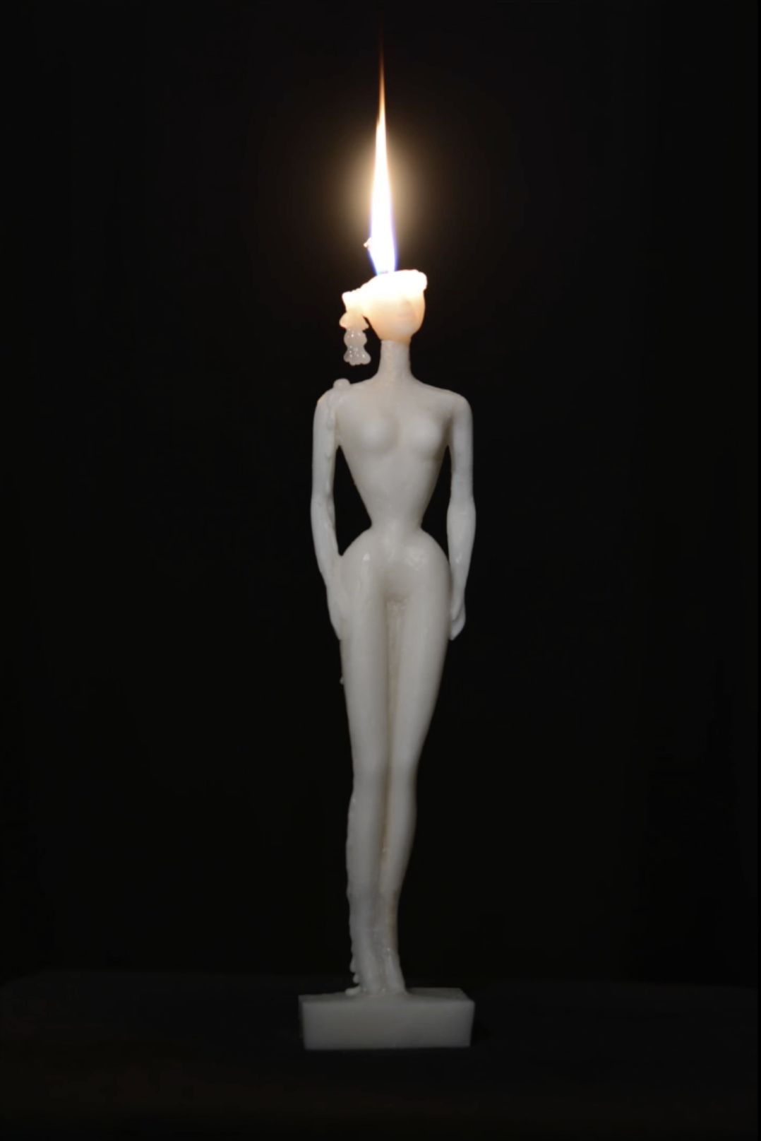 The sculpture was created by making a mold of a Barbie doll, into which candle wax and a wick were cast, resulting in a piece that serves as a functional candle.