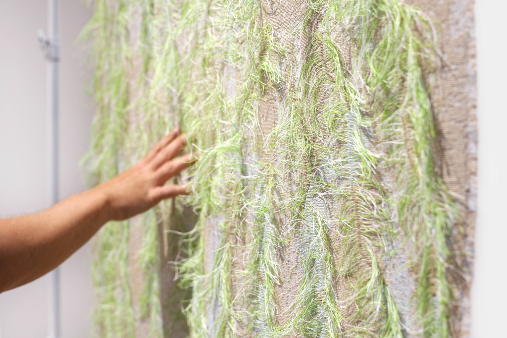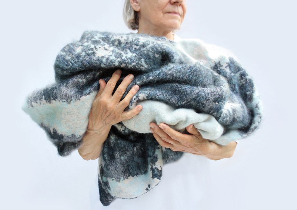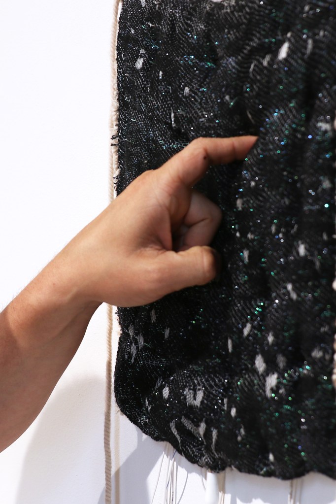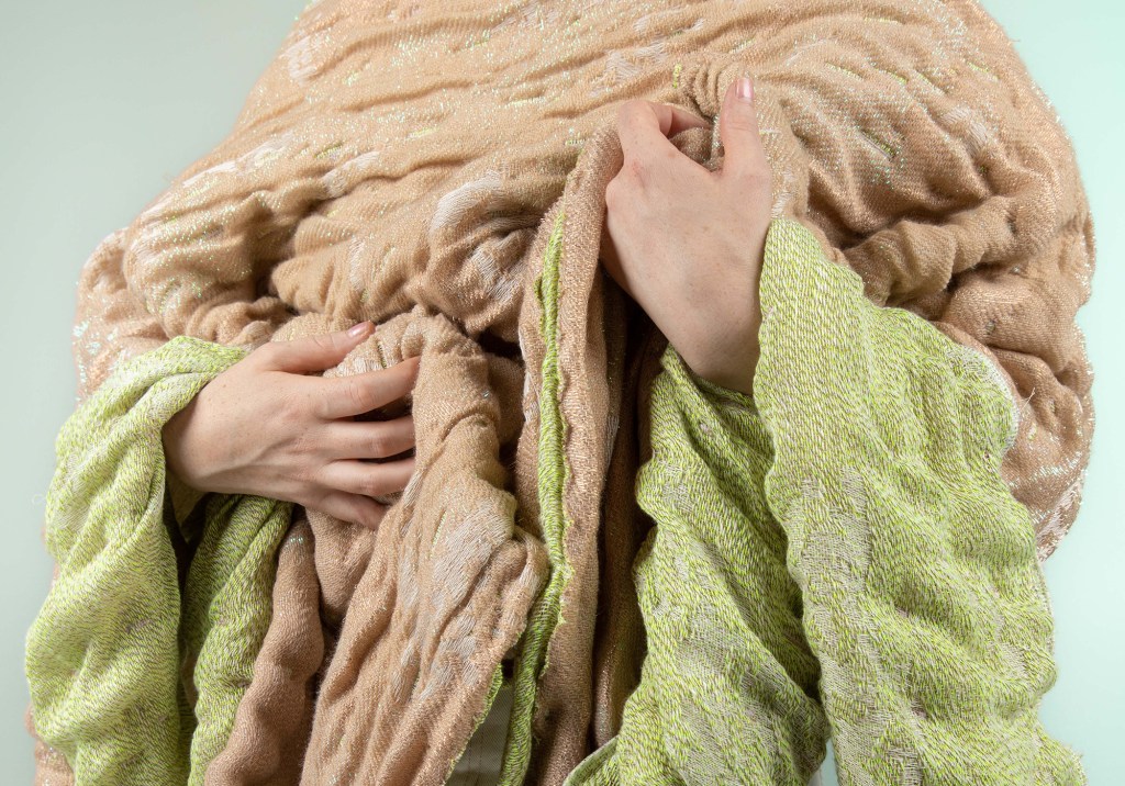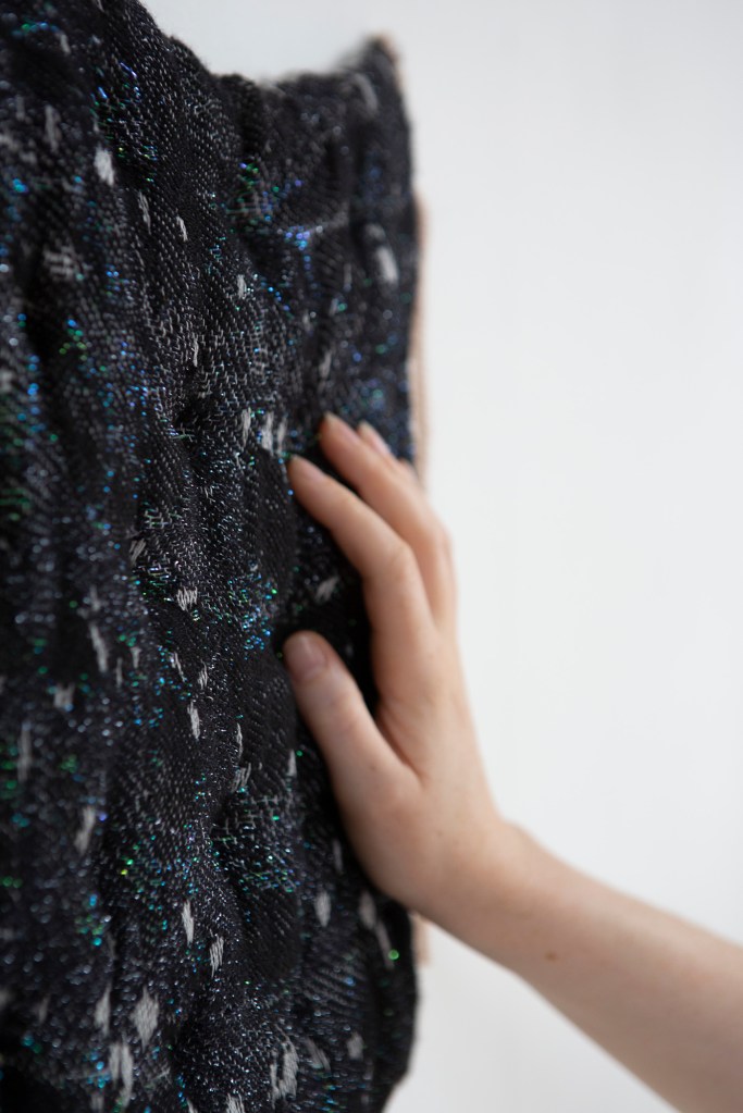 I Feel You is a textile design project that explores the potential of creating electronic textiles that imitate living beings, providing a multi-sensory experience. The multilayered textiles are woven using a Jacquard loom. When combined with electronics, they react to the touch of an exhibition visitor by inflating or vibrating, mimicking the heartbeat and breathing of animals. The textiles are woven with a cotton warp, and weft materials include mohair, wool, linen, and electrically conductive threads. Together and separated, the materials and woven structures strive to create multi-sensory, touchable worlds. Exhibition visitors were encouraged to touch and feel the textiles.
