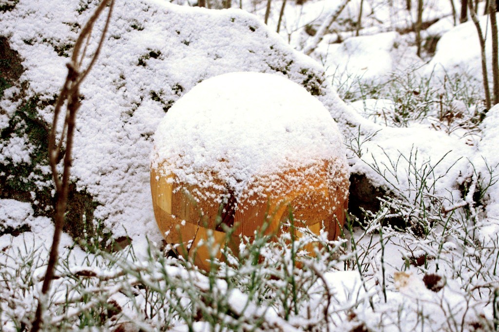 The spherical hollow sculpture is a combination of a variety of found waste wood materials. It consists of pine, birch, beech, oak, wood patterned by insects, glulam, and fiberboard. The sculpture was made in 2016 and was later taken to the forest where moisture, frost and nature have shaped it and insects have found a habitat in it.