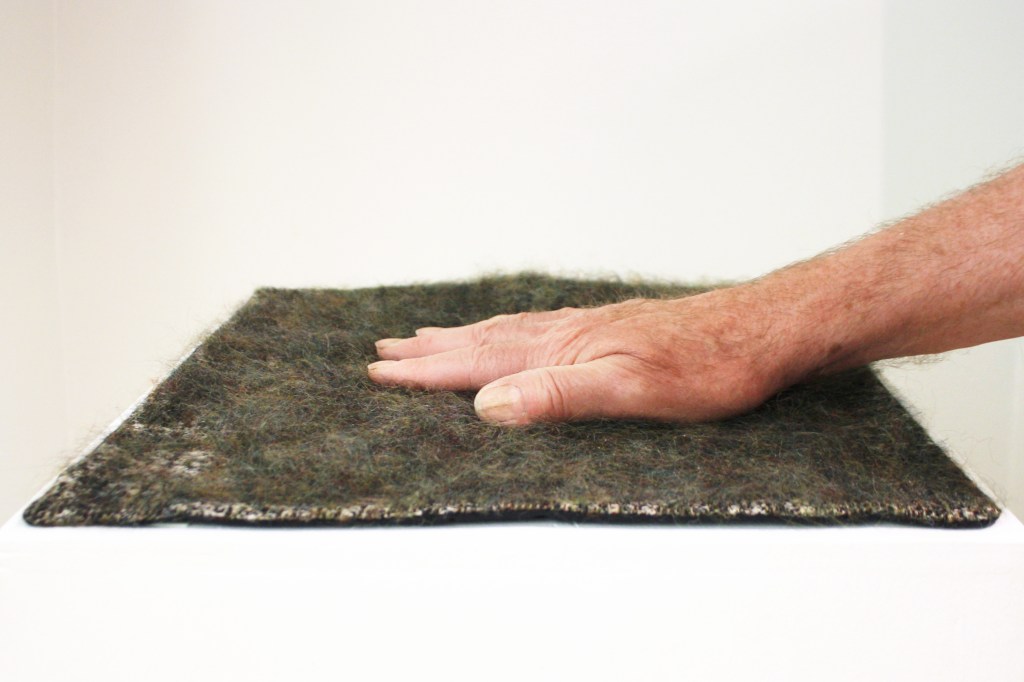 Touch me is a hand-woven jacquard textile woven on a cotton warp with mohair and electrically conductive material. Combined with electronics, the textile senses the touch of an exhibition visitor and reacts to it. When being touched, the textile inflates and deflates. The work has emerged from an interest in experiencing the world through the sense of touch, in the grounding interaction between the human body and material, and the interest in conductive textile materials and weaving.
